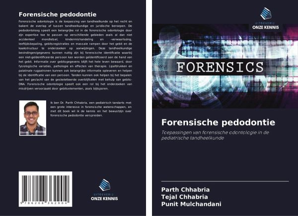 Forensische odontologie is de toepassing van tandheelkunde op het recht en bakent de overlap af tussen tandheelkundige en juridische beroepen. De pedodontoloog speelt een belangrijke rol in de forensische odontologie door zijn expertise toe te passen op verschillende gebieden zoals al dan niet accidenteel mondletsel, kindermishandeling en -verwaarlozing, leeftijdsbepaling, gebitsregistraties en massale rampen door het gebit en de kaakstructuur te onderzoeken op aanwijzingen. Deze tandheelkundige bevindingen/gegevens kunnen nuttig zijn bij forensische identificatie waarbij een niet-geïdentificeerde persoon kan worden geïdentificeerd aan de hand van het gebit. Informatie over gebitsgegevens blijft het hele leven bewaard, door fysiologische variaties, pathologie en effecten van therapie. Lipafdrukken en palatinale rugpatronen kunnen ook belangrijke informatie opleveren en helpen bij de identificatie van een persoon. Tanden kunnen ook helpen bij het bepalen van het geslacht van de geskeletteerde overblijfselen met behulp van gebits-DNA. Forensische odontologie speelt ook een rol bij het onderzoeken van misdrijven veroorzaakt door gebitselementen, zoals bijtsporen.