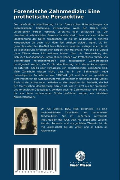 Die zahnärztliche Identifizierung ist bei forensischen Untersuchungen von entscheidender Bedeutung, insbesondere wenn der Körper einer verstorbenen Person verwest, verbrannt oder zerstückelt ist. Der Hauptvorteil zahnärztlicher Beweise besteht darin, dass sie eine einfache Identifizierung der Opfer ermöglichen, da sie im Gegensatz zu anderen Hartgeweben oft auch nach dem Tod erhalten bleiben. Opfer, die ihr gesamtes oder den Großteil ihres Gebisses besitzen, verfügen über die für die Identifizierung erforderlichen körperlichen Merkmale, während bei Opfern ohne Zähne diese Informationen fehlen. Über die Beschreibung des Gebisses hinausgehende Informationen können von Prothetikern mithilfe von beschrifteten herausnehmbaren oder festsitzenden Zahnprothesen bereitgestellt werden, die für die Identifizierung nach Massenkatastrophen, ob natürlich, zufällig oder vorsätzlich, von entscheidender Bedeutung sind. Viele Zahnärzte wissen nicht, dass es in der Zahnmedizin neue technologische Fortschritte wie CAD/CAM gibt und dass es gesetzliche Vorschriften für die Aufbewahrung von zahnärztlichen Unterlagen gibt. Dieses Buch ist ein umfassender Leitfaden zu allen Aspekten der Prothetik, der bei der forensischen Identifizierung hilfreich ist, und ist nicht nur für Prothetiker und forensische Odontologen, sondern auch für Zahntechniker und Juristen, die von dieser umfassenden Studie profitieren werden, ein nützliches Nachschlagewerk.