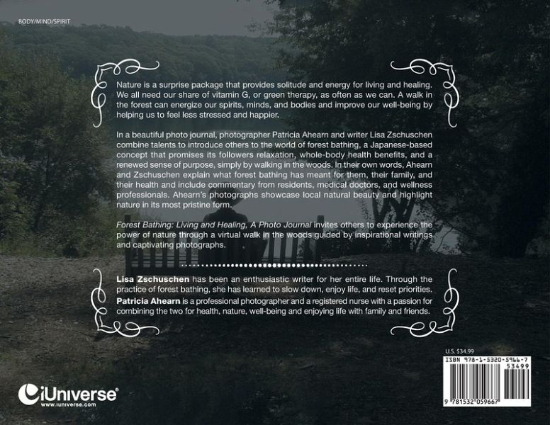 Nature is a surprise package that provides solitude and energy for living and healing. We all need our share of vitamin G, or green therapy, as often as we can. A walk in the forest can energize our spirits, minds, and bodies and improve our well-being by helping us to feel less stressed and happier. In a beautiful photo journal, photographer Patricia Ahearn and writer Lisa Zschuschen combine talents to introduce others to the world of forest bathing, a Japanese-based concept that promises its followers relaxation, whole-body health benefits, and a renewed sense of purpose, simply by walking in the woods. In their own words, Ahearn and Zschuschen explain what forest bathing has meant for them, their family, and their health and include commentary from residents, medical doctors, and wellness professionals. Ahearn's photographs showcase local natural beauty and highlight nature in its most pristine form. Forest Bathing: Living and Healing, A Photo Journal invites others to experience the power of nature through a virtual walk in the woods guided by inspirational writings and captivating photographs.