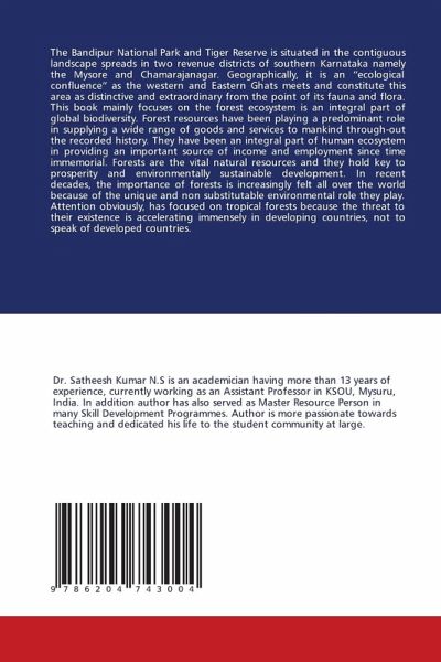 The Bandipur National Park and Tiger Reserve is situated in the contiguous landscape spreads in two revenue districts of southern Karnataka namely the Mysore and Chamarajanagar. Geographically, it is an "ecological confluence" as the western and Eastern Ghats meets and constitute this area as distinctive and extraordinary from the point of its fauna and flora. This book mainly focuses on the forest ecosystem is an integral part of global biodiversity. Forest resources have been playing a predominant role in supplying a wide range of goods and services to mankind through-out the recorded history. They have been an integral part of human ecosystem in providing an important source of income and employment since time immemorial. Forests are the vital natural resources and they hold key to prosperity and environmentally sustainable development. In recent decades, the importance of forests is increasingly felt all over the world because of the unique and non substitutable environmentalrole they play. Attention obviously, has focused on tropical forests because the threat to their existence is accelerating immensely in developing countries, not to speak of developed countries.