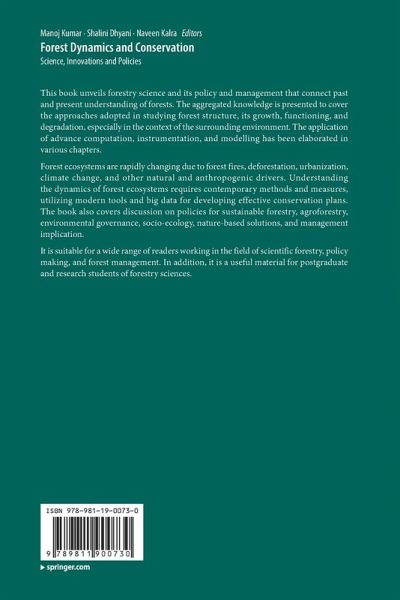 Forest ecosystems are rapidly changing due to forest fires, deforestation, urbanization, climate change, and other natural and anthropogenic drivers. Understanding the dynamics of forest ecosystems requires contemporary methods and measures, utilizing modern tools and big data for developing effective conservation plans. The book also covers discussion on policies for sustainable forestry, agroforestry, environmental governance, socio-ecology, nature-based solutions, and management implication.