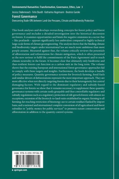 This book analyses and develops overarching concepts for forest policy and forest governance and includes a detailed investigation into the historical discussion on forests. It examines opportunities and limits for negative emissions in a sector that - like peatlands - appears significantly less ambivalent compared to highly technical large-scale forms of climate geoengineering. The analysis shows that the binding climate and biodiversity targets under international law are much more ambitious than most people assume. Measured against that, the volume critically reviews the potentials of afforestation and reforestation for climate mitigation, which is often presented as the new saviour to fulfil the commitments of the Paris Agreement and to reach climate neutrality in the future. It becomes clear that ultimately only biodiverse and thus resilient forests can function as a carbon sink in the long term. The volume shows that the existing European and international forest governance approaches fail to comply with these targets and insights. Furthermore, the book develops a bundle of policy measures. Quantity governance systems for livestock farming, fossil fuels and similar drivers of deforestations represent the most important approach. They are most effective when not directly targeting forests due to their heterogeneity but central damaging factors. With regard to the dominant regulatory and subsidy-based governance for forests we show that it remains necessary to supplement these quantity governance systems with certain easily graspable and thus controllable regulatory and subsidy regulations such as a regulatory protection of old-growth forests with almost no exceptions; extension of the livestock-to-land-ratio established in organic farming to all farming; far-reaching restriction of bioenergy use to certain residues flanked by import bans; and a national and international complete conversion of all agricultural and forest subsidies to "public money for publicservices" to promote nature conservation and afforestation in addition to the quantity control systems.