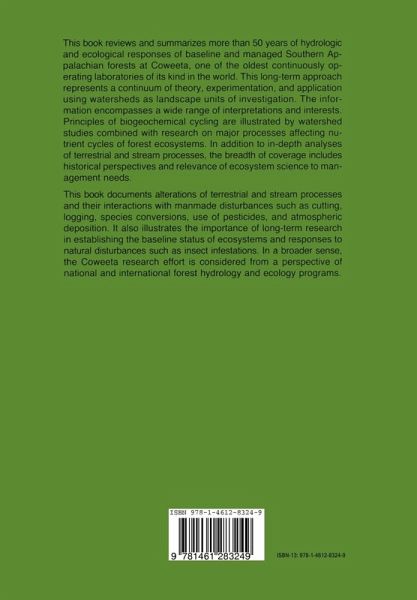 Section 1 The Coweeta Hydrologie Laboratory.- 1. Introduction and Site Description.- 2. History of Coweeta.- Section 2 Hydrology, Geology, Climate, and Water Chemistry.- 3. Climatology and Hydrology.- 4. Characterization of Baseline Precipitation and Stream Chemistry and Nutrient Budgets for Control Watersheds.- 5. Bedrock Geology and Regional Geologic Setting of Coweeta Hydrologic Laboratory in the Eastern Blue Ridge.- 6. Weathering and Soil-Forming Processes.- 7. Debris Avalanches and the Origin of First-Order Streams.- 8. Streamflow Generation by Variable Source Area.- 9. Research on Interception Losses and Soil Moisture Relationships.- Section 3 Forest Dynamics and Nutrient Cycling.- 10. Forest Communities and Patterns.- 11. Biomass, Primary Production, and Selected Nutrient Budgets for an Undisturbed Hardwood Watershed.- 12. Dynamics of Early Successional Forest Structure and Processes in the Coweeta Basin.- 13. Comparative Physiology of Successional Forest Trees.- Section 4 Canopy Arthropods and Herbivory.- 14. Foliage Consumption and Nutrient Dynamics in Canopy Insects.- 15. Canopy Arthropods and Their Response to Forest Disturbance.- Section 5 Forest Floor Processes.- 16. Changes in Soil Nitrogen Pools and Transformations Following Forest Clearcutting.- 17. Soil Arthropods and Their Role in Decomposition and Mineralization Processes.- 18. Sulfur Pools and Transformations in Litter and Surface Soil of a Hardwood Forest.- Section 6 Stream Biota and Nutrient Dynamics.- 19. Aquatic Invertebrate Research.- 20. The Trophic Significance of Dissolved Organic Carbon in Streams.- 21. Effects of Watershed Disturbance on Stream Seston Characteristics.- Section 7 Man and Management of Forested Watersheds.- 22. Streamflow Changes Associated with Forest Cutting, Species Conversions, and Natural Disturbances.- 23. Forest Access Roads: Design, Maintenance, and Soil Loss.- 24. Effects of Pesticide Applications on Forested Watersheds.- 25. Stream Chemistry Responses to Disturbance.- 26. Acid Precipitation Effects on Forest Processes.- 27. Trace Metals in the Atmosphere, Forest Floor, Soil, and Vegetation.- Section 8 Perspectives on Forest Hydrology and Long-Term Ecological Research.- 28. Forest Ecosystem Stability: Revision of the Resistance-Resilience Model in Relation to Observable Macroscopic Properties of Ecosystems.- 29. European Experiences in Long-Term Forest Hydrology Research.- 30. Past and Future of Ecosystem Research-Contribution of Dedicated Experimental Sites.- References.
