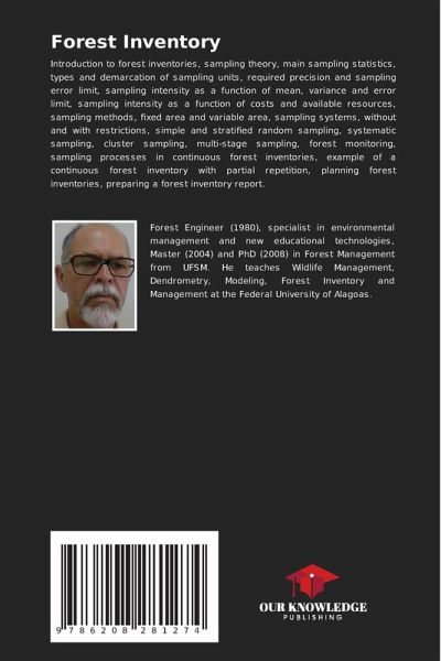 Introduction to forest inventories, sampling theory, main sampling statistics, types and demarcation of sampling units, required precision and sampling error limit, sampling intensity as a function of mean, variance and error limit, sampling intensity as a function of costs and available resources, sampling methods, fixed area and variable area, sampling systems, without and with restrictions, simple and stratified random sampling, systematic sampling, cluster sampling, multi-stage sampling, forest monitoring, sampling processes in continuous forest inventories, example of a continuous forest inventory with partial repetition, planning forest inventories, preparing a forest inventory report.