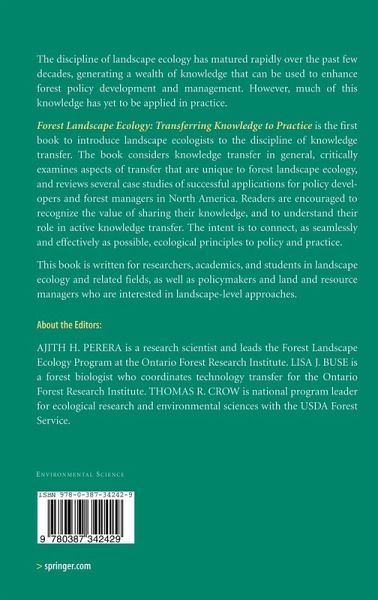 "Forest Landscape Ecology: Transferring Knowledge to Practice" is the first book to introduce landscape ecologists to the discipline of knowledge transfer. The book considers knowledge transfer in general, critically examines aspects of transfer that are unique to forest landscape ecology, and reviews several case studies of successful applications for policy developers and forest managers in North America. Readers are encouraged to recognize the value of sharing their knowledge, and to understand their role in active knowledge transfer. The intent is to connect, as seamlessly and effectively as possible, ecological principles to policy and practice.