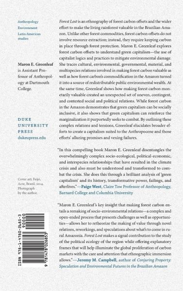 Forest Lost is an ethnography of forest carbon offsets and the wider effort to make the living rainforest valuable in the Brazilian Amazon. Unlike other forest commodities, forest carbon offsets do not involve resource extraction; instead, they require keeping carbon in place through forest protection. Maron E. Greenleaf explores forest carbon offsets to understand green capitalism-the use of capitalist logics and practices to mitigate environmental damage. She traces cultural, environmental, governmental, material, and multispecies relations involved in making forest carbon valuable as well as how forest carbon's commodification in the Amazon turned it into a source of redistributable public environmental wealth. At the same time, Greenleaf shows how making forest carbon monetarily valuable created an unexpected set of uneven, contingent, and contested social and political relations. While forest carbon in the Amazon demonstrates that green capitalism can be socially inclusive, it also shows that green capitalism can reinforce the marginalization it purportedly seeks to combat. By outlining these complex relations and tensions, Greenleaf elucidates broader efforts to create a capitalism suited to the Anthropocene and those efforts' alluring promises and vexing failures.