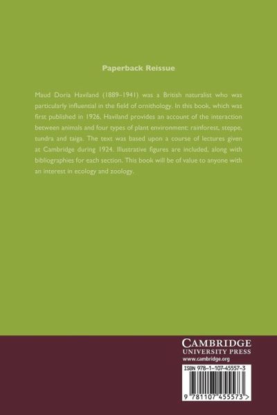 Maud Doria Haviland (1889-1941) was a British naturalist who was particularly influential in the field of ornithology. In this book, which was first published in 1926, Haviland provides an account of the interaction between animals and four types of plant environment: rainforest, steppe, tundra and taiga. The text was based upon a course of lectures given at Cambridge during 1924. Illustrative figures are included, along with bibliographies for each section. This book will be of value to anyone with an interest in ecology and zoology.
