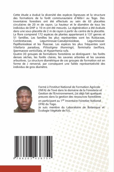 Cette étude a évalué la diversité des espèces ligneuses et la structure des formations de la forêt communautaire d'Alibi-I au Togo. Des inventaires forestiers ont été effectués au sein de 63 placettes circulaires de 20 m de rayon. La hauteur et le diamètre de tous les individus de DHP 10 m ont été mesurés. La régénération a été évaluée dans une sous-placette de 2 m de rayon à partir du centre de la placette.La flore comprend 172 espèces de plantes appartenant à 137 genres et 51 familles. Les familles les plus représentées sont les Rubiaceae, Combretaceae, Leguminosae-Caesalpinioideae, Leguminosae-Papilloniodeae et les Poaceae. Les espèces les plus fréquentes sont Vitellaria paradoxa, Piliostigma thonningii, Terminalia laxiflora, Spermacoce verticillata, et Hyparrhenia rufa.Quatre (4) groupes de formations forestières se distinguent : les forêts denses sèches, les forêts claires, les savanes arborées et les savanes arbustives. La structure diamétrique de ces groupes de formation est en forme de J renversé, par conséquent une faible représentativité des individus de gros diamètre.