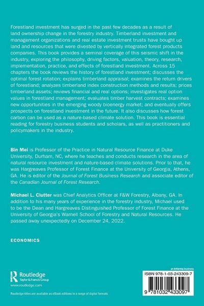 Forestland investment has surged in the past few decades as a result of land ownership change in the forestry industry. Timberland investment and management organizations and real estate investment trusts have bought up land and resources that were divested by vertically integrated forest products companies. This book provides a seminal coverage of this seismic shift in the industry, exploring the philosophy, driving factors, valuation, theory, research, implementation, practice, and effects of forestland investment. Across 15 chapters the book reviews the history of forestland investment; discusses the optimal forest rotation; explains timberland appraisal; examines the return drivers of forestland; analyzes timberland index construction methods and results; prices timberland assets; reviews financial and real options; investigates real option values in forestland management; evaluates timber harvest contracts; examines new opportunities in the emerging woody bioenergy market; and eventually offers prospects on forestland investment in the future. It also discusses how forest carbon can be used as a nature-based climate solution. This book is essential reading for forestry business students and scholars, as well as practitioners and policymakers in the industry.