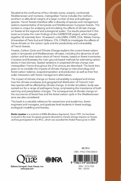 Les résultats présentés dans ce livre résument les principales observations du projet CARBOFOR, qui a réuni 52 scientifiques de 14 unités de recherche afin d'étudier les effets futurs du climat sur le cycle du carbone, la productivité et la vulnérabilité des forêts françaises. Ce livre expose le cycle du carbone actuel dans les forêts des climats tempérés et méditerranéens, la dynamique du carbone dans le sol et le stock total de carbone dans les forêts françaises, d'après les inventaires forestiers. Il donne un aperçu et illustre les principales méthodes de terrain permettant d'évaluer les stocks de carbone au sein de la biomasse des arbres. Des variations spatiales dans un schéma de changement climatique en France métropolitaine au cours du 21ème siècle sont décrits. Le livre prend ensuite en considération l'effet du changement climatique sur la phénologie des arbres et l'équilibre en carbone, l'évapotranspiration et la production d'une forêt ainsi que leur interaction de premier niveau avec les alternatives en matière de gestion forestière. L'effet du changement climatique sur la vulnérabilité de la forêt est analysée. Une étude de simulation similaire a été effectuée pour certains champignons pathogènes, en mettant l'accent tant sur le réchauffement que sur les modifications de pluviométrie. Les conséquences du changement climatique sur l'apparition d'incendies et sur le cycle du carbone des forêts dans la zone méditerranéenne sont également prises en compte. Une référence de valeur pour les chercheurs et les académiciens, les ingénieurs et les gestionnaires des eaux et forêts, ainsi que les étudiants en dernière année d'école d'écologie forestière, de modélisation écologique et de sylviculture.