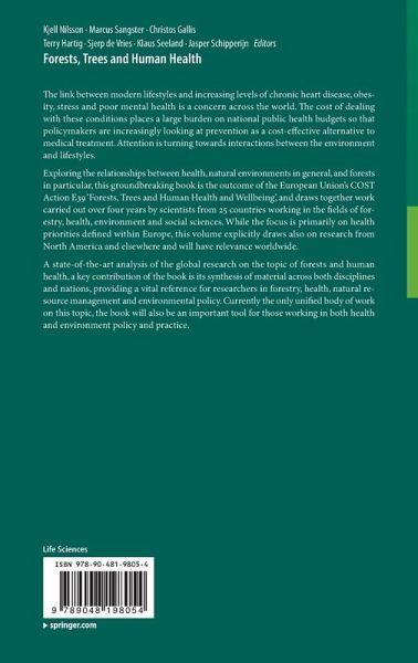 The link between modern lifestyles and increasing levels of chronic heart disease, obesity, stress and poor mental health is a concern across the world. The cost of dealing with these conditions places a large burden on national public health budgets so that policymakers are increasingly looking at prevention as a cost-effective alternative to medical treatment. Attention is turning towards interactions between the environment and lifestyles.Exploring the relationships between health, natural environments in general, and forests in particular, this groundbreaking book is the outcome of the European Union's COST Action E39 'Forests, Trees and Human Health and Wellbeing', and draws together work carried out over four years by scientists from 25 countries working in the fields of forestry, health, environment and social sciences. While the focus is primarily on health priorities defined within Europe, this volume explicitly draws also on research from North America.