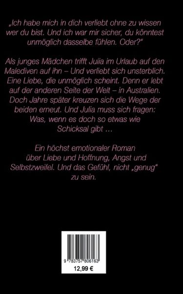 Ich habe mich in dich verliebt ohne zu wissen wer du bist. Und ich war mir sicher, du könntest unmöglich dasselbe fühlen. Oder? Als junges Mädchen trifft Julia im Urlaub auf den Malediven auf ihn. Und verliebt sich unsterblich. Eine Liebe, die unmöglich scheint. Denn er lebt auf der anderen Seite der Welt, in Australien. Doch Jahre später kreuzen sich die Wege der beiden erneut. Und Julia muss sich fragen: Was, wenn es doch so etwas wie Schicksal gibt?! Ein höchst emotionaler Roman über Liebe und Hoffnung, Angst und Selbstzweifel. Und das Gefühl, nicht genug zu sein.
