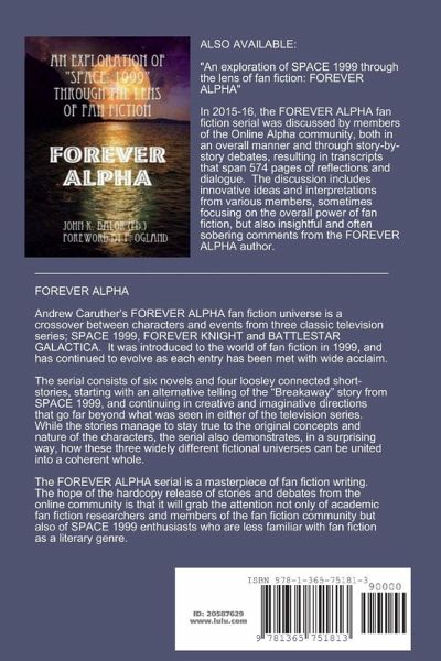 Andrew Caruthers' Forever Alpha is a masterpiece of fictional writing. Not only has his series about Moonbase Alpha been met with great enthusiasm among fans of Space 1999, but the stories contained in this book were also subject to a scholarly Online Alpha discussion that lasted for almost a year. Something that was repeated in the discussion was how Caruthers' love for the series provided him with a psychological understanding of characters and relationships that has made him into one of the leading chroniclers of the new adventures of Moonbase Alpha. This book is a must-have for all those who enjoyed Space 1999 on television and wanted the series never to end.