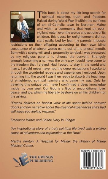 This book is about my life-long search for spiritual meaning, truth, and freedom. Raised during World War II within the confines of an all-Catholic town in Northern Maine and within a community that kept an ever-vigilant watch over the words and actions of its children, this quest for enlightenment did not start easily. Led by fear, my parents imposed restrictions on their offspring according to their own blind acceptance of whatever words came out of the priests' mouth. Born with a strong will and a propensity to rebel, I was pressured by my religious parents to choose the convent. Strangely enough, becoming a nun was the only way I could have come to the freedom that I craved. Had I opted to stay in the world and marry, I would never have had the deep realizations I awoke to through the wonderful retreats and experiences I enjoyed. Upon returning into the world I was then ready to absorb the teachings of enlightened spiritual teachers who came my way. Only by traveling this unique path have I confirmed a deep knowledge inside my own soul: Our God is a God of unconditional love, peace, and joy, which he liberally bestows on all his children for the asking.