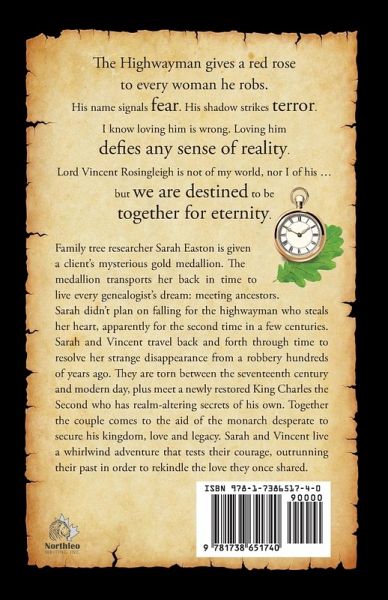 Genealogist Sarah Easton doesn't remember her husband, Vincent, yet she most certainly should. In 2023, Sarah's family history client lends her a gold medallion plus a portrait miniature of dashing highwayman Lord Vincent Rosingleigh. Sarah tries on the medallion and is transported back in time to 1666 England, a country still reeling from Oliver Cromwell's savage, grey Interregnum. Sarah arrives in riding clothes, soaked by a puddle on the laundry room floor of Vincent's elegant manor house. Their formal portrait over the mantle convinces her they shared a past life together, and their passion instantly rekindles. A visit to the Royal Court of King Charles the Second reveals that the monarch holds deep secrets, secrets that will undoubtedly change the course of history if the couple refuses to intervene. Sarah is forced to make an unthinkable decision: abandon the husband she passionately loves or alter the future by following Vincent's gentlemanly yet dangerous criminal path.
