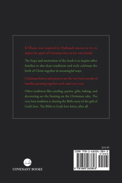 KTRome was inspired by Hallmark movies to try to depict the spirit of Christmas love in her own family. The hope and motivation of the book is to inspire other families to also share traditions and truly celebrate the birth of Christ together in meaningful ways. Christmas letters and pictures are the very best records of families growing together each and every year. Other traditions like caroling, parties, gifts, baking, and decorating are the frosting on the Christmas cake. The very best tradition is sharing the Bible story of the gift of God's love. The Bible is God's love letter, after all.