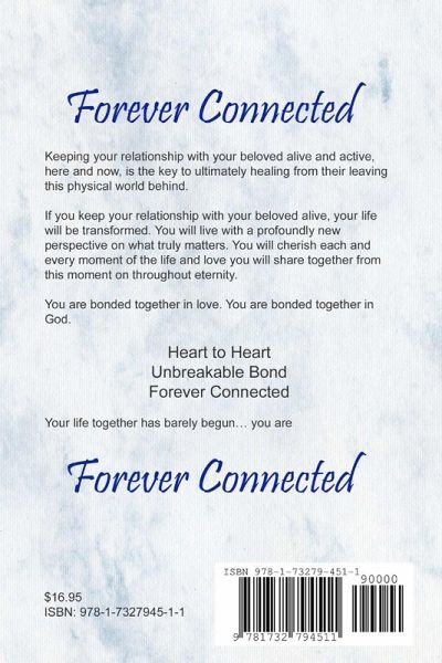 "Forever Connected" is a highly personal, emotionally intense story of eternal love and commitment. It is written for those grieving the loss of someone they loved deeply. The fundamental premise of the book is that you can heal from that loss by keeping your relationship with your beloved actively alive in your heart and mind. It directly opposes the notion that healing ultimately requires moving on from your loved one and moving them into memory. This book is written from the unique perspective of someone who is neither religious nor an atheist. An alternative title could have been, "A pathway to God for the non-religious." It describes Bill's personal journey of building belief in Marnie's living soul by building belief in a living God who is the source and substance of that soul. Forever Connected describes a relationship of profound love and intensity that challenged the boundaries and limits of society every step along the way and continues to do so even in death.