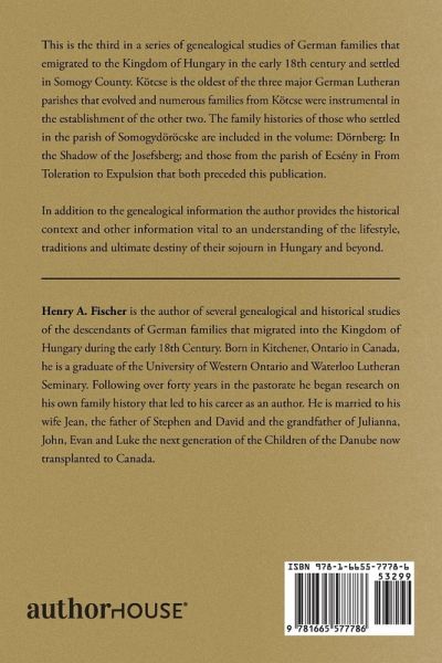 This is the third in a series of genealogical studies of German families that emigrated to the Kingdom of Hungary in the early 18th century and settled in Somogy County. Kötcse is the oldest of the three major German Lutheran parishes that evolved and numerous families from Kötcse were instrumental in the establishment of the other two. The family histories of those who settled in the parish of Somogydöröcske are included in the volume: Dörnberg: In the Shadow of the Josefsberg; and those from the parish of Ecsény in From Toleration to Expulsion that both preceded this publication. In addition to the genealogical information the author provides the historical context and other information vital to an understanding of the lifestyle, traditions and ultimate destiny of their sojourn in Hungary and beyond.