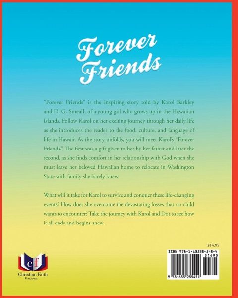 "Forever Friends" is the inspiring story told by Karol Barkley and D. G. Smeall, of a young girl who grows up in the Hawaiian Islands. Follow Karol on her exciting journey through her daily life as she introduces the reader to the food, culture, and language of life in Hawaii. As the story unfolds, you will meet Karol's "Forever Friends." The first was a gift given to her by her father and later the second, as she finds comfort in her relationship with God when she must leave her beloved Hawaiian home to relocate in Washington State with family she barely knew. What will it take for Karol to survive and conquer these life-changing events? How does she overcome the devastating losses that no child wants to encounter? Take the journey with Karol and Dot to see how it all ends and begins anew.