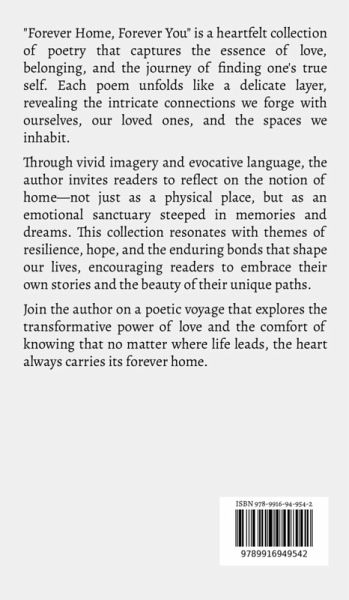 "Forever Home, Forever You" is a heartfelt collection of poetry that captures the essence of love, belonging, and the journey of finding one's true self. Each poem unfolds like a delicate layer, revealing the intricate connections we forge with ourselves, our loved ones, and the spaces we inhabit. Through vivid imagery and evocative language, the author invites readers to reflect on the notion of home-not just as a physical place, but as an emotional sanctuary steeped in memories and dreams. This collection resonates with themes of resilience, hope, and the enduring bonds that shape our lives, encouraging readers to embrace their own stories and the beauty of their unique paths. Join the author on a poetic voyage that explores the transformative power of love and the comfort of knowing that no matter where life leads, the heart always carries its forever home.