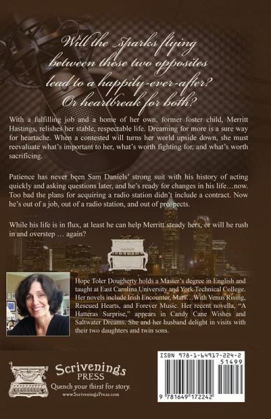 With a fulfilling job and a home of her own, former foster child, Merritt Hastings, relishes her stable, respectable life. Dreaming for more is a sure way for heartache. When a contested will turns her world upside down, she must revaluate what's important to her, what's worth fighting for, and what's worth sacrificing. Patience has never been Sam Daniels' strong suit with his history of acting quickly and asking questions later, and he's ready for changes in his life ... now. Too bad the plans for acquiring a radio station didn't include a contract. Now he's out of a job, out of a radio station, and out of prospects. While his life is in flux, at least he can help Merritt steady hers, or will he rush in and overstep ... again? Will the sparks flying between these two opposites lead to a happily-ever-after or heartbreak for both?