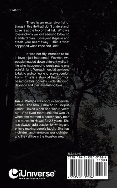 There is an extensive list of things in this life that I don’t understand. Love is at the top of that list. Who we love and why we love seem to follow no standard plan. Love just steps in and steals your heart away. That is what happened when Irene and I met. It was not my intention to fall in love; it just happened. We were two people headed down different walks in life who happened to cross paths one painful night. We each needed someone to talk to and someone to receive comfort from. This is a story of that comfort based on their honesty, understanding, devotion and their everlasting love.