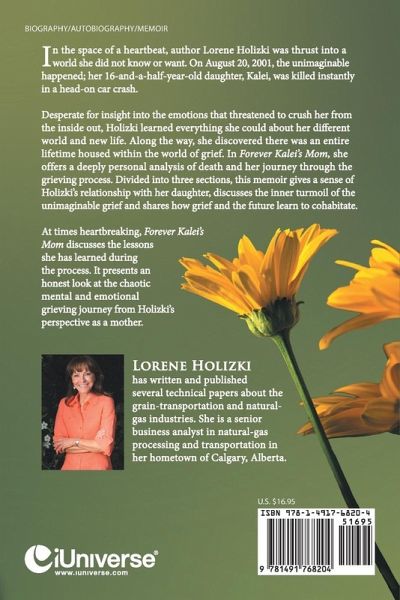 In the space of a heartbeat, author Lorene Holizki was thrust into a world she did not know or want. On August 20, 2001, the unimaginable happened; her 16-and-a-half-year-old daughter, Kalei, was killed instantly in a head-on car crash. Desperate for insight into the emotions that threatened to crush her from the inside out, Holizki learned everything she could about her different world and new life. Along the way, she discovered there was an entire lifetime housed within the world of grief. In Forever Kalei's Mom, she offers a deeply personal analysis of death and her journey through the grieving process. Divided into three sections, this memoir gives a sense of Holizki's relationship with her daughter, discusses the inner turmoil of the unimaginable grief and shares how grief and the future learn to cohabitate. At times heartbreaking, Forever Kalei's Mom discusses the lessons she has learned during the process. It presents an honest look at the chaotic mental and emotional grieving journey from Holizki's perspective as a mother.