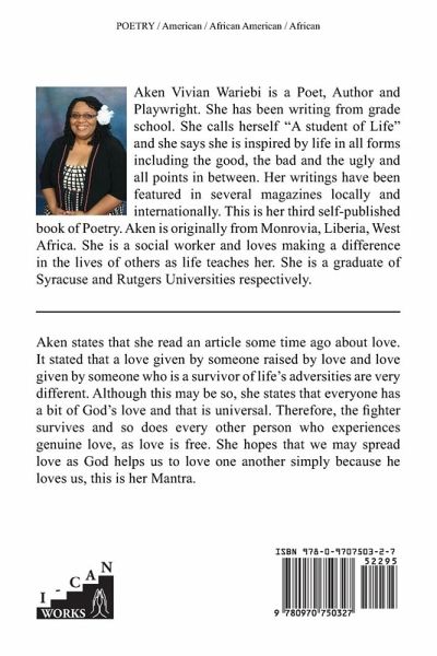 Aken Vivian Wariebi is a Poet, Author and Playwright. She has been writing from grade school. She calls herself "A student of Life" and she says she is inspired by life in all forms including the good, the bad and the ugly and all points in between. Her writings have been featured in several magazines locally and internationally. This is her third self-published book of Poetry. Aken is originally from Monrovia, Liberia, West Africa. She is a social worker and loves making a difference in the lives of others as life teaches her. She is a graduate of Syracuse and Rutgers Universities respectively.