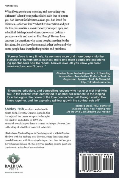 What if you awoke one morning and everything was different? What if your path collided with that of a man you had known for lifetimes, a man you had loved for lifetimes-a forever love? What if reincarnation and past life traumas ran like a movie before your open eyes, and what if all this happened when you were an ordinary person-a wife and mother like Nancy? Forever Love answers the questions why some people, meeting for the first time, feel they have known each other before and why some people have inexplicable phobias and problems. "Forever Love is very timely. As we move more and more deeply into the Separated in Past Lives, evolution of human consciousness, more and more people are experiencing spontaneous past life recalls. Forever Love lets you know you aren't alone and you aren't crazy. " -Elmdea Bean, bestselling author of Liberating Incarnations: Twenty-Five Stories of Past Life Regression, Speaker, Past Life Therapist. http://elmdeabean.com "Engaging, articulate, and compelling, anyone who has ever met their twin soul in this lifetime while committed to another will resonate to the longing for union again, the power of the love connection built through myriad lifetimes together, and the explosive spiritual growth the contact sets off!" Barbara Stone, PhD, author of Invisible Roots: How Healing Past Life Trauma Can Liberate Our Present