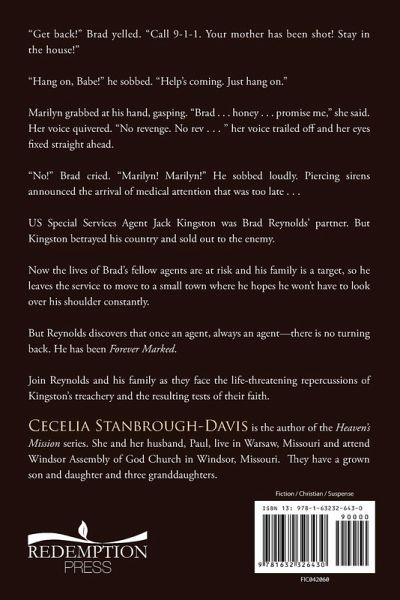"Get back!" Brad yelled. "Call 9-1-1. Your mother has been shot! Stay in the house!" "Hang on, Babe!" he sobbed. "Help's coming. Just hang on." Marilyn grabbed at his hand, gasping. "Brad . . . honey . . . promise me," she said. Her voice quivered. "No revenge. No rev . . . " her voice trailed off and her eyes fixed straight ahead. "No!" Brad cried. "Marilyn! Marilyn!" He sobbed loudly. Piercing sirens announced the arrival of medical attention that was too late . . . US Special Services Agent Jack Kingston was Brad Reynolds' partner. But Kingston betrayed his country and sold out to the enemy. Now the lives of Brad's fellow agents are at risk and his family is a target, so he leaves the service to move to a small town where he hopes he won't have to look over his shoulder constantly. But Reynolds discovers that once an agent, always an agent-there is no turning back. He has been Forever Marked. Join Reynolds and his family as they face the life-threatening repercussions of Kingston's treachery and the resulting tests of their faith.