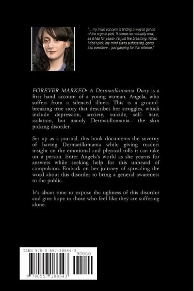 FOREVER MARKED: A Dermatillomania Diary is a first hand account of a young woman, Angela, who suffers from a silenced illness. This is a ground- breaking true story that describes her struggles, which include depression, anxiety, suicide, self- hate, isolation, but mainly Dermatillomania... the skin picking disorder.