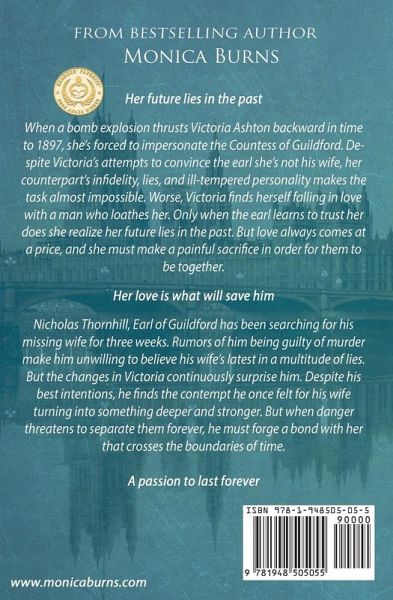 2015 GOLD MEDAL Winner, Readers' Favorite International Book Awards; 2015 BRONZE MEDAL Winner, IPPY Awards; USA Today HEA Blog 2015 Must-Read This book contains a feisty modern-day heroine determined to win the frozen heart of a proper English earl. (Trigger Warning For Language/Steam below.) Thrown back to the year 1897, Victoria Ashton is mistaken for, and forced to impersonate, the spiteful, unfaithful Countess of Guildford, who's been missing for three weeks. Despite Victoria's attempts to convince the earl she's not his wife, her double's infidelity and lies make it difficult, especially when Victoria falls in love with a man who loathes her. Nicholas Thornhill, Earl of Guildford, is plagued with rumors he murdered his missing wife. When she unexpectedly reappears, he scoffs at her latest in a long string of lies. But the changes in Victoria make him to alter his opinion as he forges a bond with her that crosses the boundaries of time. NOTE: This book is a 125,000 words as there are TWO story lines. For readers who do not enjoy sex scenes, there is 3.75% of sexual content in this book (16 pgs out of 443). The F-word is used 34 times in this 443 page book (that's 1% of the entire book ) .Men, as a general rule, have used the F-word long before the Victorian era, which this book is set in. The author used the F-word because it fits a reaction by a frustrated, angry male. It is a visceral word with a guttural sound and projects the emotion of outrage in a harsh and visceral manner. Men are always crass & crude with other men. In contrast to the use of the F-word the author refuses to use the word sh*t as it evokes an image of filth and bodily waste. Please factor this information into your buying decision. Finally, this book has a happy ending for the couple, it has a reincarnation twist. If you didn't like A Knight In Shining Author or are uncomfortable with all the info above it's doubtful you'll enjoy the book. So Don't Buy It. For readers of time travel romance who enjoyed OUTLANDER and A KNIGHT IN SHINING ARMOR.... "Forever Mine is the best time travel romance I've ever read, rivaling Jude Deveraux for intensity and chemistry between the hero and heroine."- Lucy Monroe, USAToday bestselling author "With Forever Mine, Monica Burns delivers another gorgeous and deeply emotional story with a smart, strong-willed heroine and a tortured and oh-so-sexy hero." - Vanessa Kelly. USAToday bestselling author of historical romance "Monica Burns has once again gotten me to read and love a historical romance! Forever Mine is a phenomenally written story of a love that surpasses the barriers of time. At the end I cried ugly, gut-wrenching tears which I rarely do. The emotional last few chapters bled through my Kindle and directly into my soul. Monica Burns has written something truly magical. Forever Mine surpassed my expectations by miles and then kept on going." -Nikki Brandyberry, Ramblings from a Chaotic Mind This book is like the center of an Oreo, the best part of the cookie. Monica Burns has captured true [time travel] romance and woven it into a time travel/reincarnation tale. The characters are so well developed and true. - Joann Ferrara Maggio Reader Review