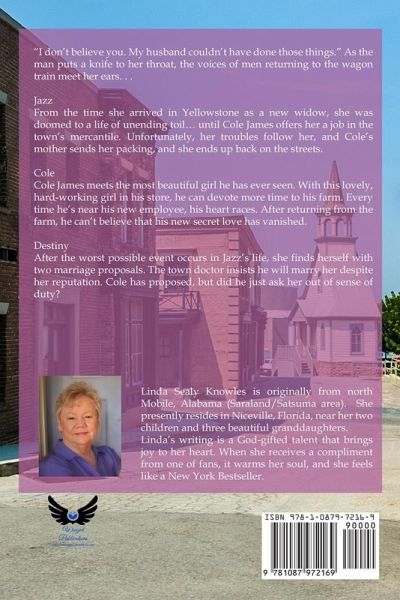 "I don't believe you. My husband couldn't have done those things." As the man puts a knife to her throat, the voices of men returning to the wagon train meet her ears. . . Jazz From the time she arrived in Yellowstone as a new widow, she was doomed to a life of unending toil... until Cole James offers her a job in the town's mercantile. Unfortunately, her troubles follow her, and Cole's mother sends her packing, and she ends up back on the streets. Cole Cole James meets the most beautiful girl he has ever seen. With this lovely, hard-working girl in his store, he can devote more time to his farm. Every time he's near his new employee, his heart races. After returning from the farm, he can't believe that his new secret love has vanished. Destiny After the worst possible event occurs in Jazz's life, she finds herself with two marriage proposals. The town doctor insists he will marry her despite her reputation. Cole has proposed, but did he just ask her out of sense of duty?