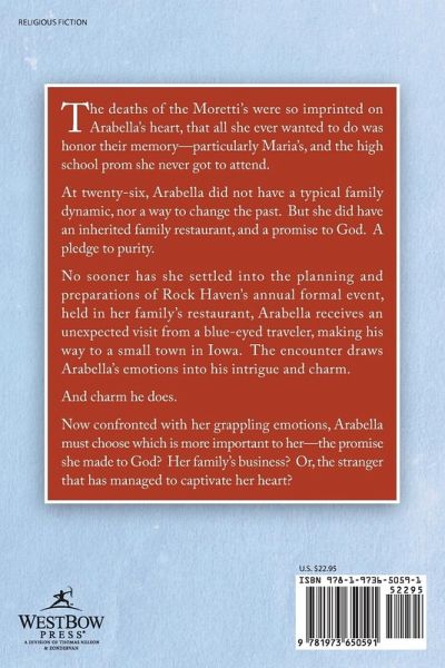 The deaths of the Moretti's were so imprinted on Arabella's heart, that all she ever wanted to do was honor their memory-particularly Maria's, and the high school prom she never got to attend. At twenty-six, Arabella did not have a typical family dynamic, nor a way to change the past. But she did have an inherited family restaurant, and a promise to God. A pledge to purity. No sooner has she settled into the planning and preparations of Rock Haven's annual formal event, held in her family's restaurant, Arabella receives an unexpected visit from a blue-eyed traveler, making his way to a small town in Iowa. The encounter draws Arabella's emotions into his intrigue and charm. And charm he does. Now confronted with her grappling emotions, Arabella must choose which is more important to her-the promise she made to God? Her family's business? Or, the stranger that has managed to captivate her heart?