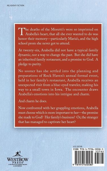 The deaths of the Moretti's were so imprinted on Arabella's heart, that all she ever wanted to do was honor their memory-particularly Maria's, and the high school prom she never got to attend. At twenty-six, Arabella did not have a typical family dynamic, nor a way to change the past. But she did have an inherited family restaurant, and a promise to God. A pledge to purity. No sooner has she settled into the planning and preparations of Rock Haven's annual formal event, held in her family's restaurant, Arabella receives an unexpected visit from a blue-eyed traveler, making his way to a small town in Iowa. The encounter draws Arabella's emotions into his intrigue and charm. And charm he does. Now confronted with her grappling emotions, Arabella must choose which is more important to her-the promise she made to God? Her family's business? Or, the stranger that has managed to captivate her heart?
