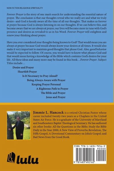 Forever Prayer is the story of one man's search for understanding the essential nature of prayer. The conclusion is that our thoughts reveal who we really are and what we truly desire--and God is keenly aware all the time of all our thoughts. That makes us forever at prayer because God is always listening in on our thoughts. If we can believe this, and become aware that we are always at prayer, our lives will become more in tune with God's presence and desires as revealed to us in his Word. Forever Prayer will enlighten and renew your thinking about prayer. Have you ever considered your thoughts being known to God? That would mean you are always at prayer because God would always know your desires at all times. It would also make it very important to maintain good thoughts that please God. Also, good behavior would be expected to follow. Of course, you would have to know what pleases God and that would mean having a knowledge of the Bible which contains God's desires for your life.