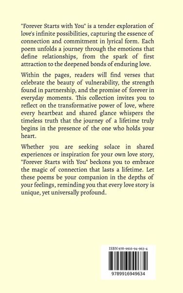 "Forever Starts with You" is a tender exploration of love's infinite possibilities, capturing the essence of connection and commitment in lyrical form. Each poem unfolds a journey through the emotions that define relationships, from the spark of first attraction to the deepened bonds of enduring love. Within the pages, readers will find verses that celebrate the beauty of vulnerability, the strength found in partnership, and the promise of forever in everyday moments. This collection invites you to reflect on the transformative power of love, where every heartbeat and shared glance whispers the timeless truth that the journey of a lifetime truly begins in the presence of the one who holds your heart. Whether you are seeking solace in shared experiences or inspiration for your own love story, "Forever Starts with You" beckons you to embrace the magic of connection that lasts a lifetime. Let these poems be your companion in the depths of your feelings, reminding you that every love story is unique, yet universally profound.