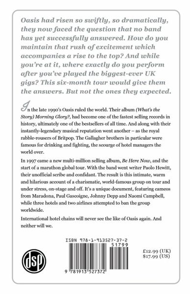 Oasis had risen so swiftly, so dramatically, they now faced the question that no band has yet successfully answered. How do you maintain that rush of excitement which accompanies a rise to the top? And while you're at it, where exactly do you perform after you've played the biggest-ever UK gigs? This six-month tour would give them the answers. But not the ones they expected. In the late 1990's Oasis ruled the world. Their album (What's the Story) Morning Glory?, had become one of the fastest selling records in history, ultimately one of the bestsellers of all time. And along with their instantly-legendary musical reputation went another - as the royal rabble-rousers of Britpop. The Gallagher brothers in particular were famous for drinking and fighting, the scourge of hotel managers the world over. In 1997 came a new multi-million selling album, Be Here Now, and the start of a marathon global tour. With the band went writer Paolo Hewitt, their unofficial scribe and confidant. The result is this intimate, warm and hilarious account of a charismatic, world-famous group on tour and under stress, on-stage and off. It's a unique document, featuring cameos from Maradona, Paul Gascoigne, Johnny Depp and Naomi Campbell, while three hotels and two airlines attempted to ban the group worldwide. International hotel chains will never see the like of Oasis again. And neither will we.