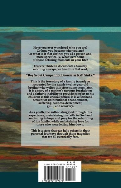 Have you ever wondered who you are? Or how you became who you are? Or what is it that defines you as a person and, more specifically, what were some of those defining moments in your life? Forever Thirteen documents a Sunday morning newspaper headline that read, "Boy Scout Camper, 13, Drowns as Raft Sinks." This is the true story of a family tragedy as recounted by the nearly twelve-year-old brother who writes this story some years later. It is a story of a mother's nervous breakdown and a father's inability to provide comfort to his children at this critical period. It is a firsthand account of unintentional abandonment, suffering, sadness, detachment, guilt, and recovery. As a youth, the author struggled through this experience, maintaining his faith in God and continuing to hope and pray for the rebuilding of his family, while maintaining love for those who were letting him down. This is a story that can help others in their personal journeys through those tragedies that we all eventually face.
