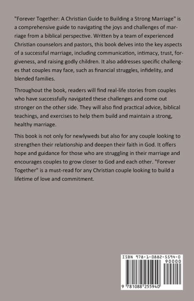 "Forever Together: A Christian Guide to Building a Strong Marriage" is a comprehensive guide to navigating the joys and challenges of marriage from a biblical perspective. Written by a team of experienced Christian counselors and pastors, this book delves into the key aspects of a successful marriage, including communication, intimacy, trust, forgiveness, and raising godly children. It also addresses specific challenges that couples may face, such as financial struggles, infidelity, and blended families. Throughout the book, readers will find real-life stories from couples who have successfully navigated these challenges and come out stronger on the other side. They will also find practical advice, biblical teachings, and exercises to help them build and maintain a strong, healthy marriage. This book is not only for newlyweds but also for any couple looking to strengthen their relationship and deepen their faith in God. It offers hope and guidance for those who are struggling in their marriage and encourages couples to grow closer to God and each other. "Forever Together" is a must-read for any Christian couple looking to build a lifetime of love and commitment.