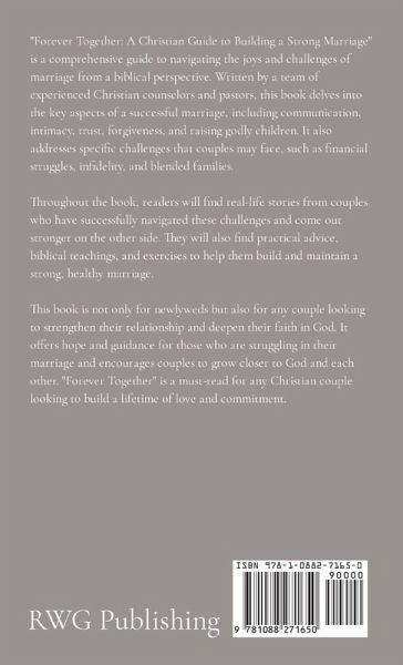 "Forever Together: A Christian Guide to Building a Strong Marriage" is a comprehensive guide to navigating the joys and challenges of marriage from a biblical perspective. Written by a team of experienced Christian counselors and pastors, this book delves into the key aspects of a successful marriage, including communication, intimacy, trust, forgiveness, and raising godly children. It also addresses specific challenges that couples may face, such as financial struggles, infidelity, and blended families. Throughout the book, readers will find real-life stories from couples who have successfully navigated these challenges and come out stronger on the other side. They will also find practical advice, biblical teachings, and exercises to help them build and maintain a strong, healthy marriage. This book is not only for newlyweds but also for any couple looking to strengthen their relationship and deepen their faith in God. It offers hope and guidance for those who are struggling in their marriage and encourages couples to grow closer to God and each other. "Forever Together" is a must-read for any Christian couple looking to build a lifetime of love and commitment.