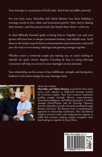 Your marriage is a sacred part of God's plan. And it has incredible potential. For over forty years, Marcellus and Valerie Bonner have been building a marriage rooted in love, faith, and intentional growth. Now, they're sharing their journey-and the practical tools that helped them thrive-with you. In their biblically founded guide to being Forever Together, you and your spouse will learn how to deepen emotional intimacy and rebuild trust. You'll discover the simple steps for better communication and connection, and you'll pave the road to overcoming challenges and growing stronger together. Whether you're a newlywed couple just starting out, or you're looking to rekindle the spark, Forever Together: Unveiling the Keys to Lasting Marriage Connection will help you invest in your marriage's eternal potential. Your relationship can be a source of joy, fulfillment, strength, and lasting love. Embrace God's divine design for your marriage today. About the Authors Marcellus and Valerie Bonner, married for forty-three years, work together as dedicated marriage coaches for Christian couples. They have extensive experience guiding couples through effective communication, emotional intelligence, and biblical principles. Certified through Enrich/Prepare and the Marriage Dynamics Institute. Marcellus trained in financial coaching through Ramsey Solutions. The Bonners have a comprehensive approach to relationship enrichment. They use biblical wisdom, practical tools, and compassionate support to fulfill their mission: helping couples strengthen their bond and grow together in Jesus Christ.