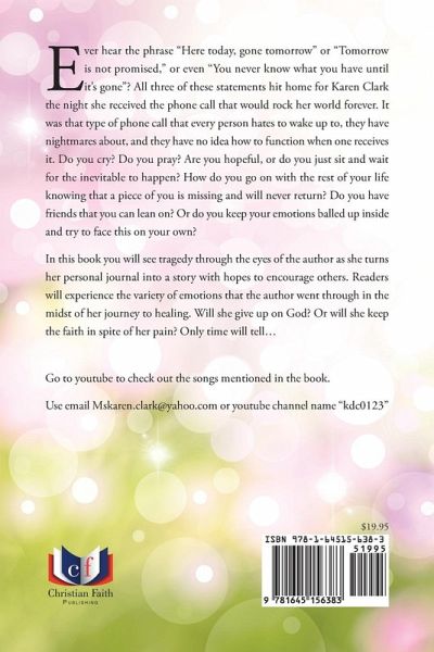 Ever hear the phrase "Here today, gone tomorrow" or "Tomorrow is not promised," or even "You never know what you have until it's gone"? All three of these statements hit home for Karen Clark the night she received the phone call that would rock her world forever. It was that type of phone call that every person hates to wake up to, they have nightmares about, and they have no idea how to function when one receives it. Do you cry? Do you pray? Are you hopeful, or do you just sit and wait for the inevitable to happen? How do you go on with the rest of your life knowing that a piece of you is missing and will never return? Do you have friends that you can lean on? Or do you keep your emotions balled up inside and try to face this on your own? In this book you will see tragedy through the eyes of the author as she turns her personal journal into a story with hopes to encourage others. Readers will experience the variety of emotions that the author went through in the midst of her journey to healing. Will she give up on God? Or will she keep the faith in spite of her pain? Only time will tell... Go to youtube to check out the songs mentioned in the book. Use email Mskaren.clark@yahoo.com or youtube channel name "kdc0123"