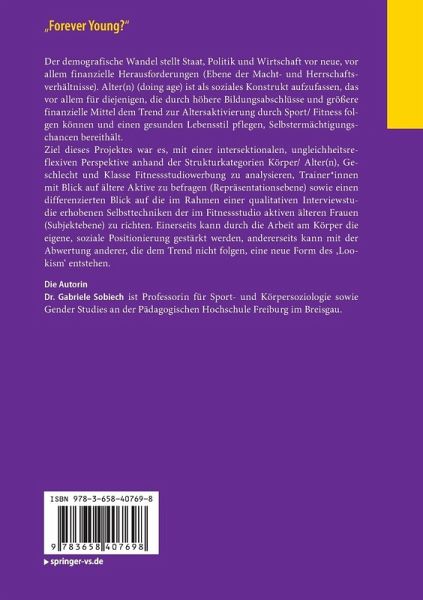 Ziel dieses Projektes war es, mit einer intersektionalen, ungleichheitsreflexiven Perspektive anhand der Strukturkategorien Körper/ Alter(n), Geschlecht und Klasse Fitnessstudiowerbung zu analysieren, Trainer_innen mit Blick auf ältere Aktive zu befragen (Repräsentationsebene) sowie einen differenzierten Blick auf die im Rahmen einer qualitativen Interviewstudie erhobenen Selbsttechniken der im Fitnessstudio aktiven älteren Frauen (Subjektebene) zu richten. Einerseits kann durch die Arbeit am Körper die eigene, soziale Positionierung gestärkt werden, andererseits kann mit der Abwertung anderer, die dem Trend nicht folgen, eine neue Form des 'Lookism' entstehen.