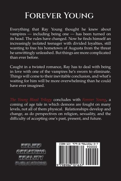 Everything that Ray Young thought he knew about vampires - including being one - has been turned on its head. The rules have changed. Now he finds himself an increasingly isolated teenager with divided loyalties, still wanting to free his hometown of Augusta from the threat he unwittingly unleashed. But things are more complicated than ever before. Caught in a twisted romance, Ray has to deal with being in love with one of the vampires he's sworn to eliminate. Things will come to their inevitable conclusion, and what's waiting for him will be more overwhelming than he could have ever imagined. The Young Blood Trilogy concludes with Forever Young, a coming of age tale in which demons are fought on many levels, not all of them physical. Relationships develop and change, as do perspectives on religion, sexuality, and the difficulty of accepting one's past, present, and future.