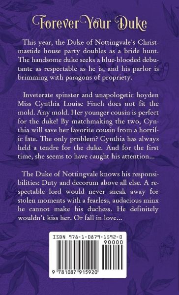 From a New York Times bestselling author: A forbidden love, opposites attract romp between a meticulously proper duke and an impishly improper spinster in this witty, feel-good romance! This year, the Duke of Nottingvale's Christmastide house party doubles as a bride hunt. The handsome duke seeks a blue-blooded debutante as respectable as he is, and his parlor is brimming with paragons of propriety. Inveterate spinster and unapologetic hoyden Miss Cynthia Louise Finch does not fit the mold. Any mold. Her younger cousin is perfect for the duke! By matchmaking the two, Cynthia will save her favorite cousin from a horrific fate. The only problem? Cynthia has always held a tendre for the duke. And for the first time, she seems to have caught his attention... The Duke of Nottingvale knows his responsibilities: Duty and decorum above all else. A respectable lord would never sneak away for stolen moments with a fearless, audacious minx he cannot make his duchess. He definitely wouldn't kiss her. Or fall in love... The 12 Dukes of Christmas is a series of heartwarming Regency romps nestled in a picturesque snow-covered village. After all, nothing heats up a winter night quite like finding oneself in the arms of a duke! ¿
