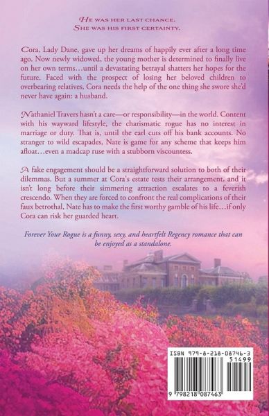 He was her last chance. She was his first certainty. Cora, Lady Dane, gave up her dreams of happily ever after a long time ago. Now newly widowed, the young mother is determined to finally live on her own terms...until a devastating betrayal shatters her hopes for the future. Faced with the prospect of losing her beloved children to overbearing relatives, Cora needs the help of the one thing she swore she'd never have again: a husband. Nathaniel Travers hasn't a care-or responsibility-in the world. Content with his wayward lifestyle, the charismatic rogue has no interest in marriage or duty. That is, until the earl cuts off his bank accounts. No stranger to wild escapades, Nate is game for any scheme that keeps him afloat...even a madcap ruse with a stubborn viscountess. A fake engagement should be a straightforward solution to both of their dilemmas. But a summer at Cora's estate tests their arrangement, and it isn't long before their simmering attraction escalates to a feverish crescendo. When they are forced to confront the real complications of their faux betrothal, Nate has to make the first worthy gamble of his life...if only Cora can risk her guarded heart. Forever Your Rogue is a swoony, sexy, and heartfelt Regency romance that can be enjoyed as a standalone.