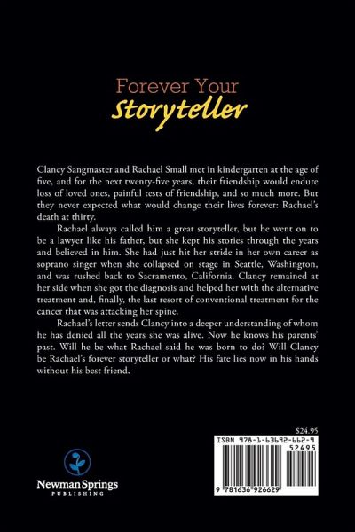 Clancy Sangmaster and Rachael Small met in kindergarten at the age of five, and for the next twenty-five years, their friendship would endure loss of loved ones, painful tests of friendship, and so much more. But they never expected what would change their lives forever: Rachael's death at thirty. Rachael always called him a great storyteller, but he went on to be a lawyer like his father, but she kept his stories through the years and believed in him. She had just hit her stride in her own career as soprano singer when she collapsed on stage in Seattle, Washington, and was rushed back to Sacramento, California. Clancy remained at her side when she got the diagnosis and helped her with the alternative treatment and, finally, the last resort of conventional treatment for the cancer that was attacking her spine. Rachael's letter sends Clancy into a deeper understanding of whom he has denied all the years she was alive. Now he knows his parents' past. Will he be what Rachael said he was born to do? Will Clancy be Rachael's forever storyteller or what? His fate lies now in his hands without his best friend.