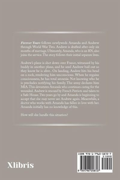 Forever Yours follows newlyweds Amanda and Andrew through World War Two. Andrew is drafted after only six months of marriage. Ultimately, Amanda, who is an RN, also joins the service. The story follows their initial separate lives. Andrew's plane is shot down over France, witnessed by his buddy in another plane, and he seed Andrew bail out so they know he is alive.. On landing, Andree hits his head on a rock, rendering him unconscious. When he regains consciousness, he has total amnesia. Not knowing who he is precludes notifying his family. The army declares him MIA. This devastates Amanda who continues caring for the wounded. Andrew is rescued by French Patriots and taken to a Safe House. Two years go by and Amanda is beginning to accept that she may never see Andrew again. Meanwhile, a doctor who works with Amanda has fallen in love with her. Amanda initially has no knowledge of this. How will she handle this situation?