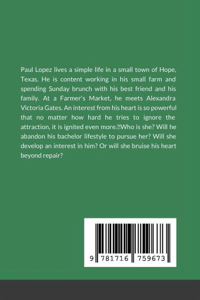 Paul Lopez lives a simple life in a small town of Hope, Texas. He is content working in his small farm and spending Sunday brunch with his best friend and his family. At a Farmer's Market, he meets Alexandra Victoria Gates. An interest from his heart is so powerful that no matter how hard he tries to ignore the attraction, it is ignited even more. Who is she? Will he abandon hi s bachelor lifestyle to pursue her? Will she develop an interest in him? Or will she bruise his heart beyond repair?